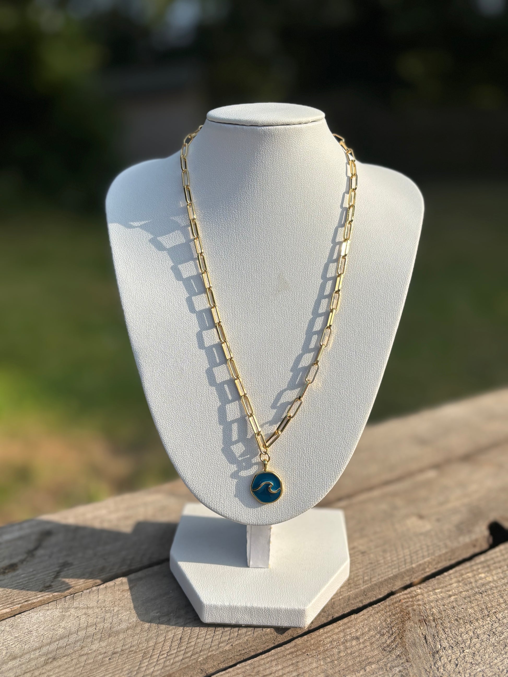 18k gold plated brass paperclip chain necklace with a gold plated wave pendent charm and an extension chain