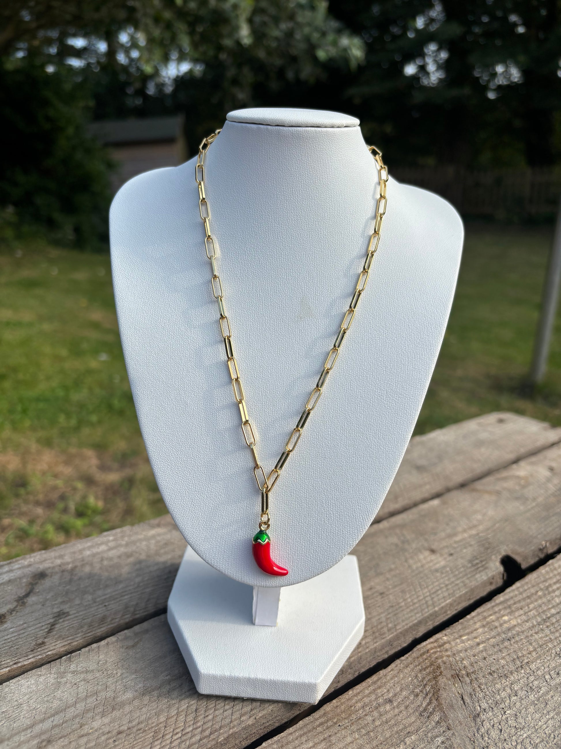 18k gold plated brass paperclip chain necklace with a gold plated chilly charm and an extension chain