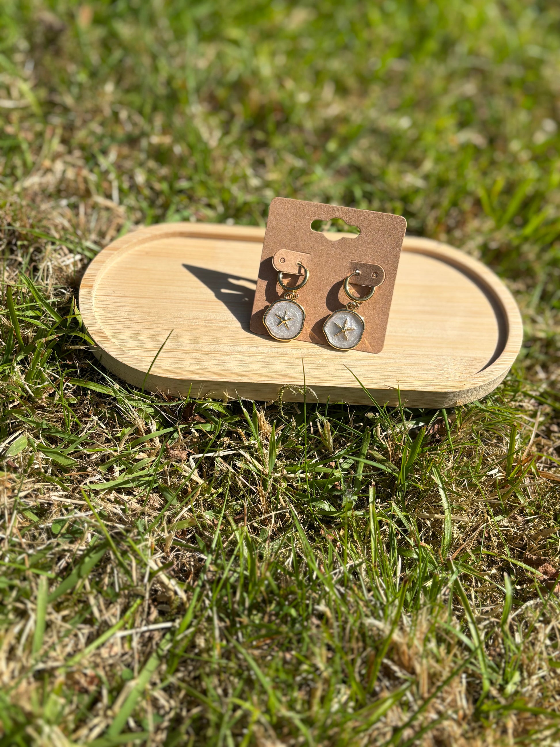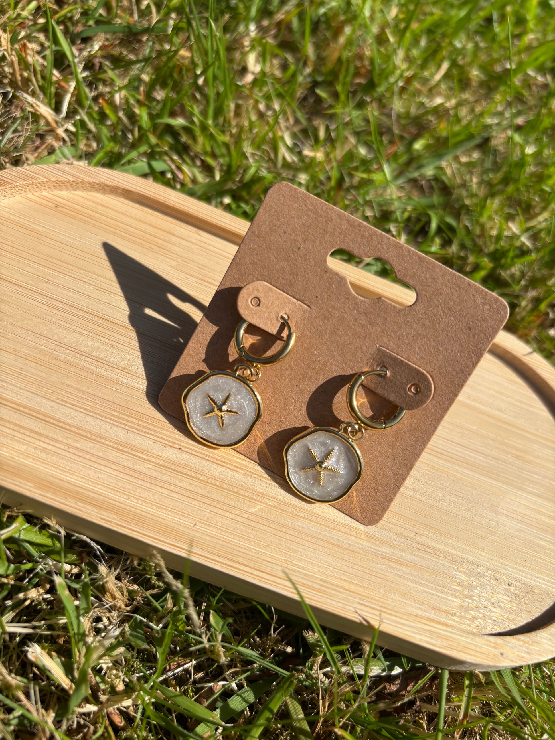 304 stainless steel, 18k gold plated huggie hoops with a white starfish charm